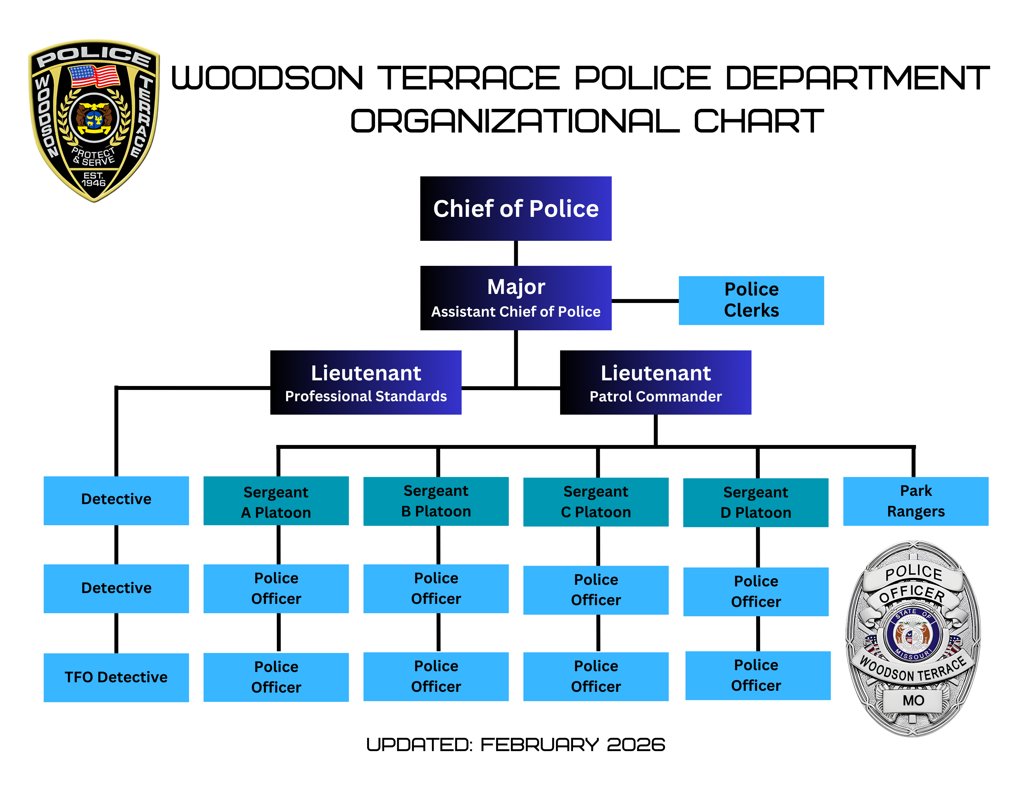 The City of Woodson Terrace is divided into two geographical areas called sectors. The watch commander will assign officers to each sector. When officers are assigned to particular areas of the city, it provides blanket coverage and enhances quicker response times. It also allows officers to quickly respond to other areas as needed. The patrol division prides itself on providing a quick response and serving the community.