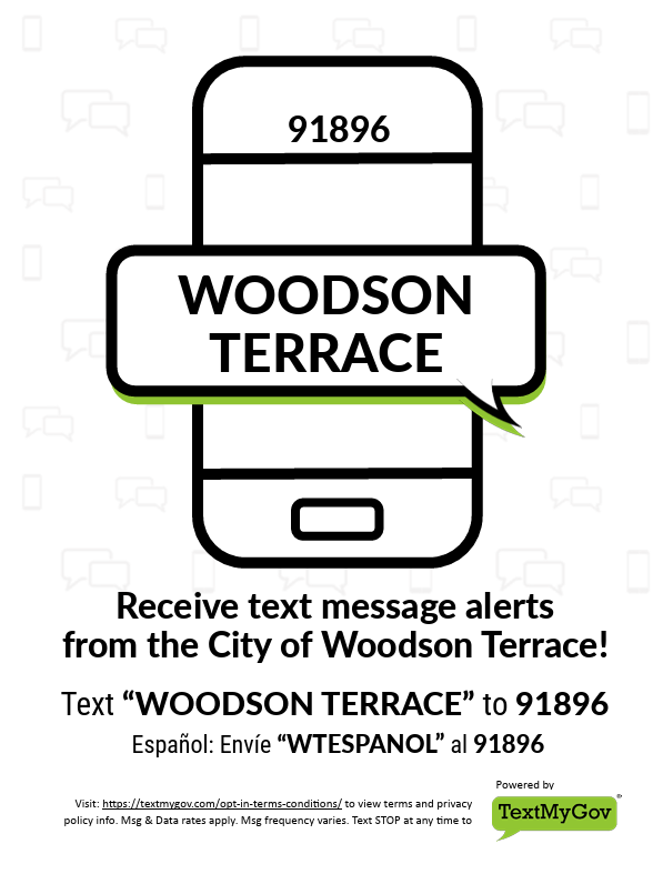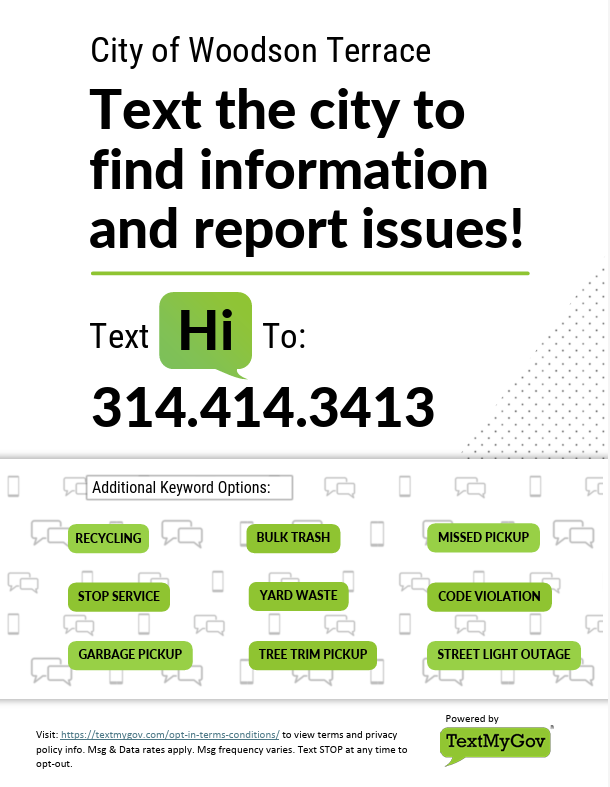text “Hi” to the City of Woodson Terrace at: (314) - 414 - 3413